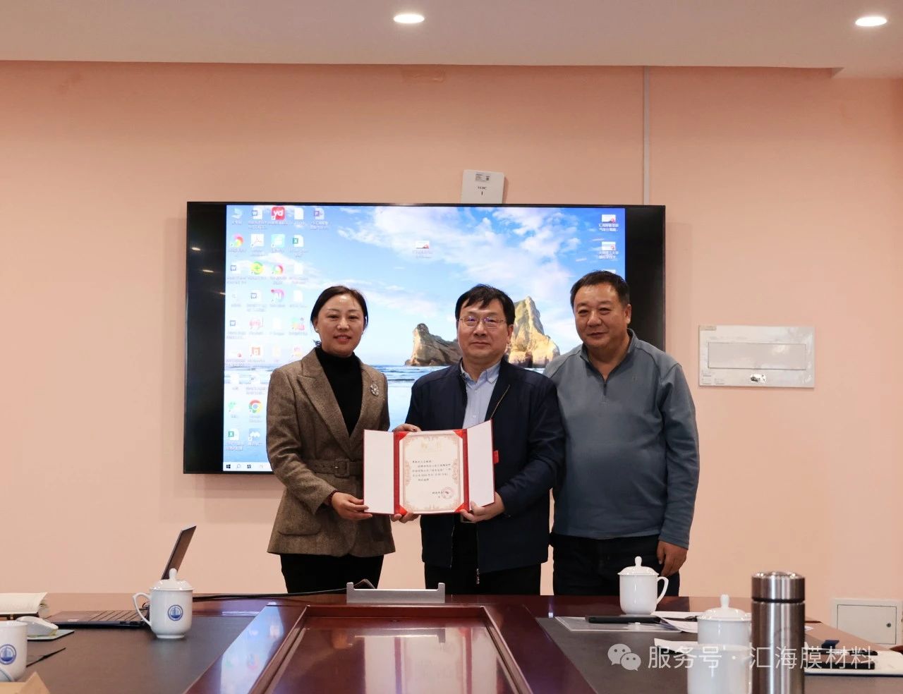 1月6日,新年伊始,山東匯海膜材料科技有限公司董事長謝忠寶一行到天津大學化工學院調研,天津大學化工學院副院長李炳志教授、化學工程聯合國家重點實驗室(天津大學)主任王志教授參加調研并座談,會上隆重舉行了王志教授技術總監聘任儀式,天津大學化學工程研究所所長王越教授主持活動。